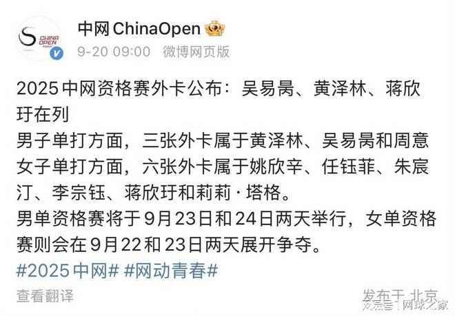 9月20日下午,2025年中国网球公开赛资格赛外卡名单正式公布。男子方面,三张外卡归属中国香港选手黄泽林、中国大陆选手吴易昺和周意,而原本被承诺获得外卡的孙发京意外无缘。