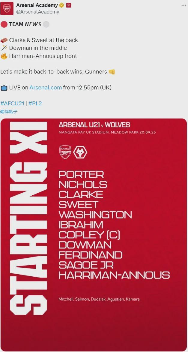 北京时间周六晚,道曼首发出战了阿森纳u21对阵狼队的英超预备队比赛。而阿森纳对曼城的比赛在周日晚……