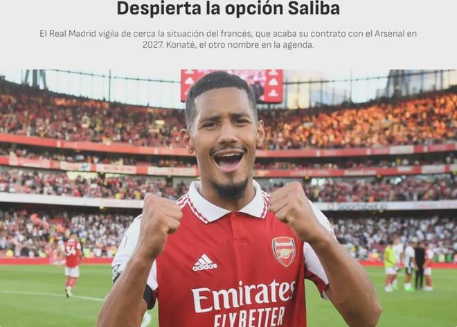 阿斯报消息,利物浦中卫科纳特只是皇马加强后防线的B计划,阿森纳中卫萨利巴才是他们明年夏天的第一目标。
