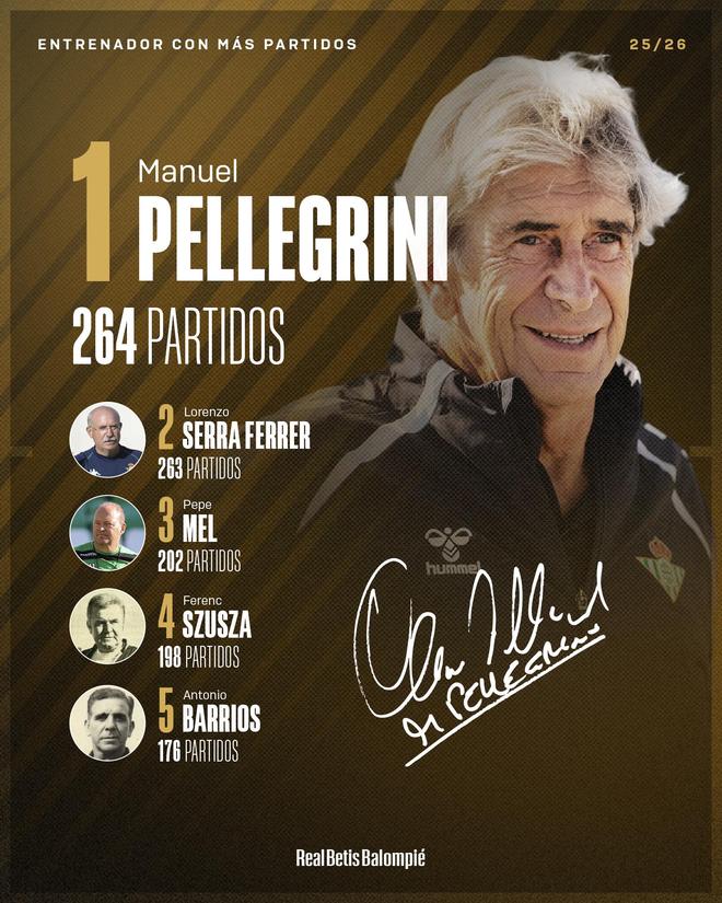 本场比赛,贝蒂斯主帅佩莱格里尼也迎来里程碑。此役是他执教皇家贝蒂斯的第264场比赛,他也正式超越塞拉·费雷尔成为皇家贝蒂斯队史执教场次最多的主教练。
