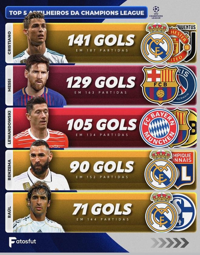 欧冠历史进球榜前五(数据截至北京时间2025年10月2日)