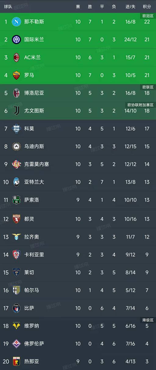 - 意甲 | 意甲第10轮结束了8场比赛,最新积分榜如下!