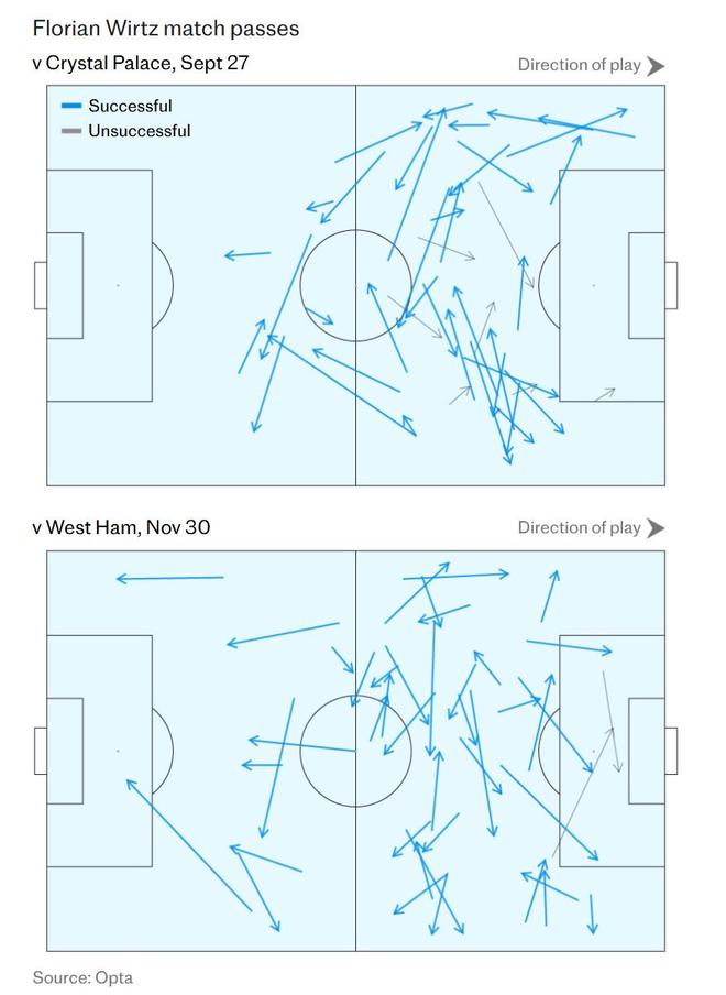 维尔茨在德甲和国家队有过从边路内切进攻的历史,斯洛特在利物浦也曾这样使用他,但这并非俱乐部引进他的初衷。与本赛季早些时候客场对阵水晶宫那场效率低下的比赛相比,本场最显著的变化是维尔茨频繁出现在左路及肋部区域,他与加克波以及左后卫凯尔凯兹形成了良好的连线。